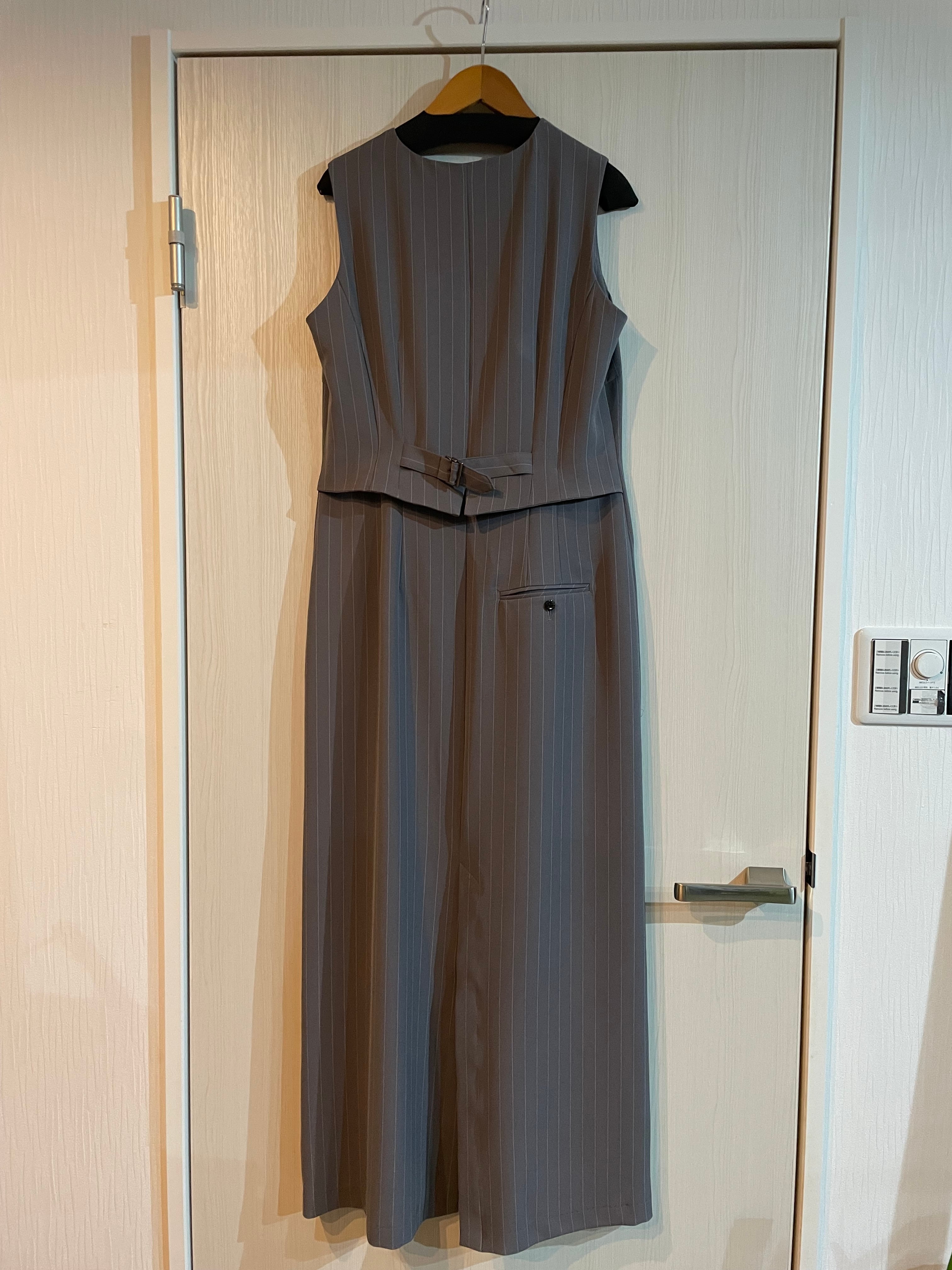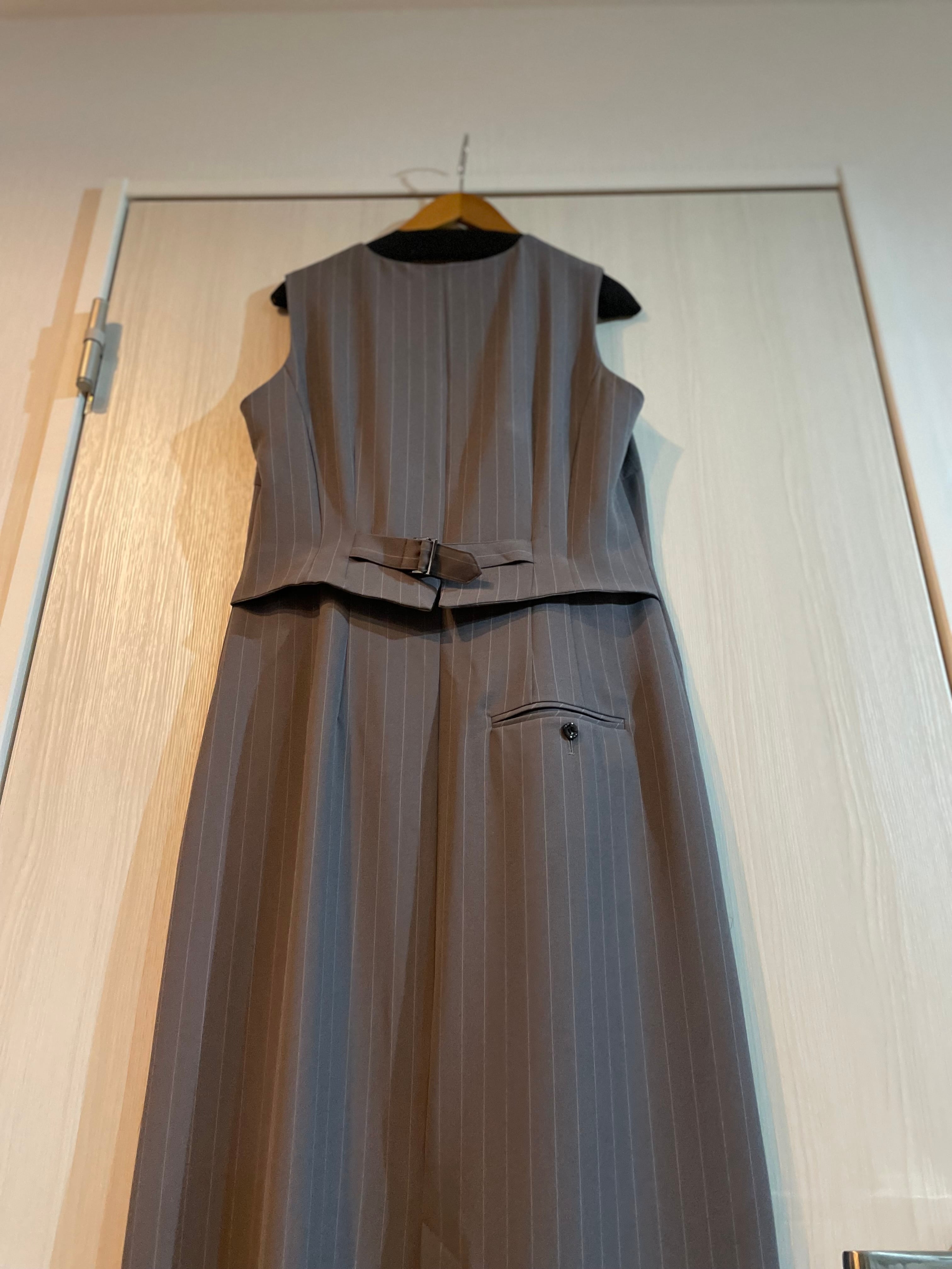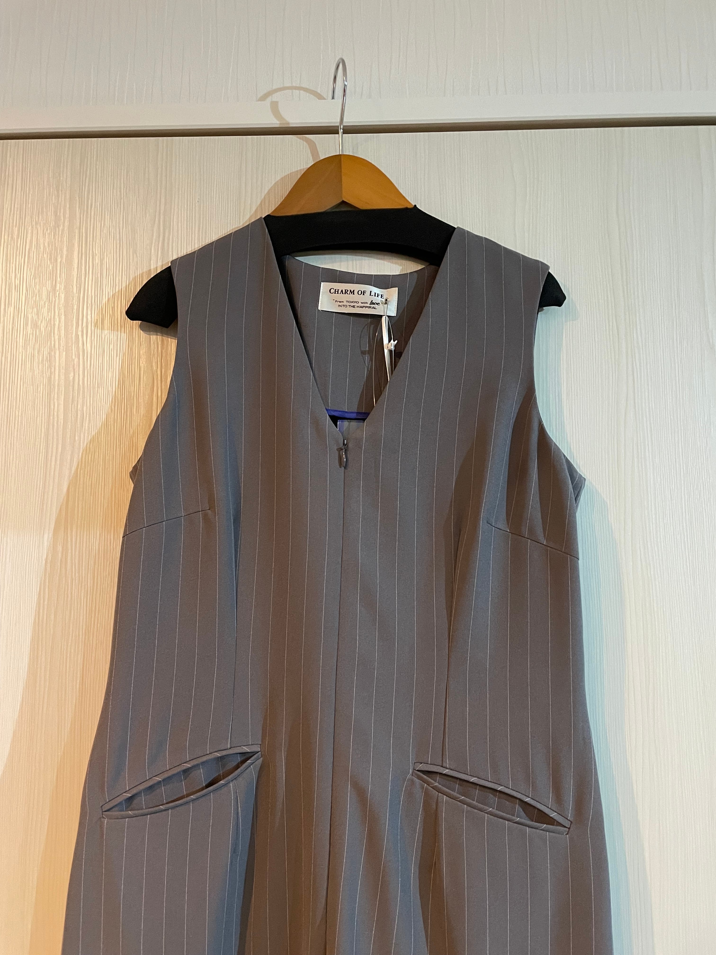 エレガントでありながらカジュアルな雰囲気を兼ね備えたピンストライプジレジャンスカです!着痩せ効果に優れたデザインが、シルエットを引き立て、ストレッチの効いた素材が快適な着心地を実現します。セットアップ風のスタイルは、インナーを着てもしなくてもオシャレに決まるため、普段使いはもちろん、特別なシーンにも幅広く活躍することでしょう。どんなトップスとも合わせやすく、コーディネートの幅を広げる一着です。