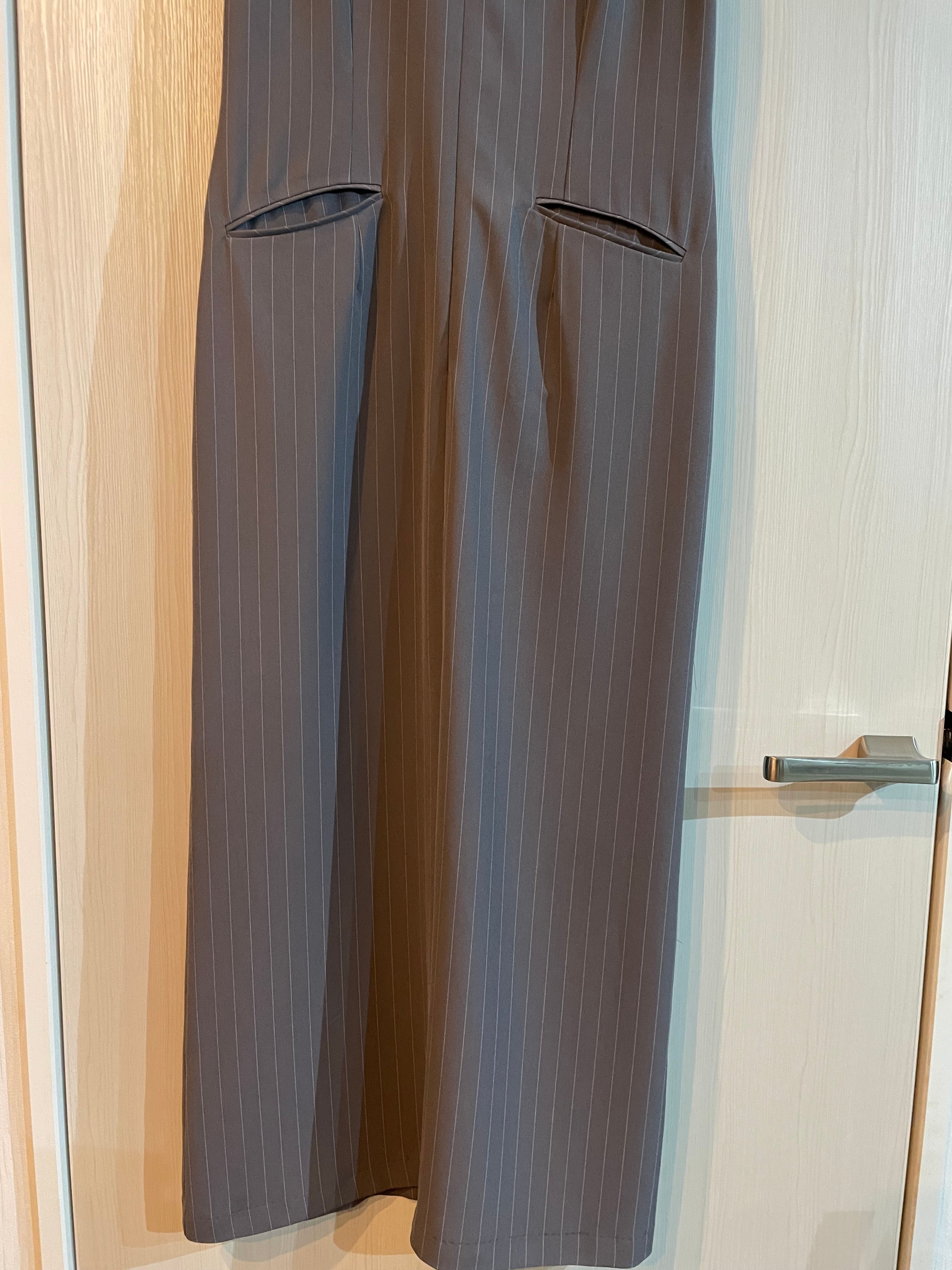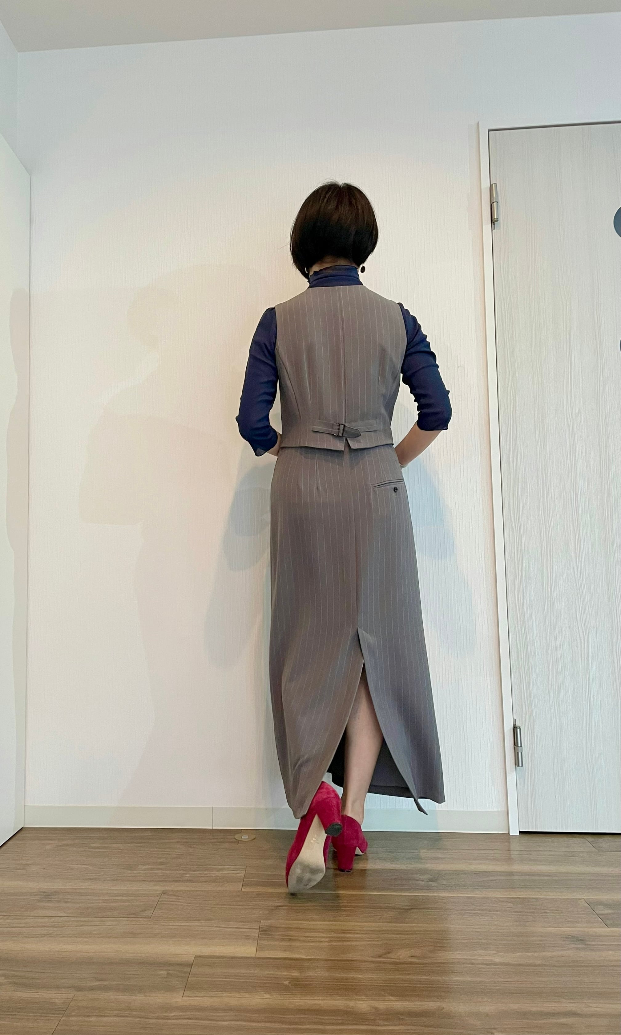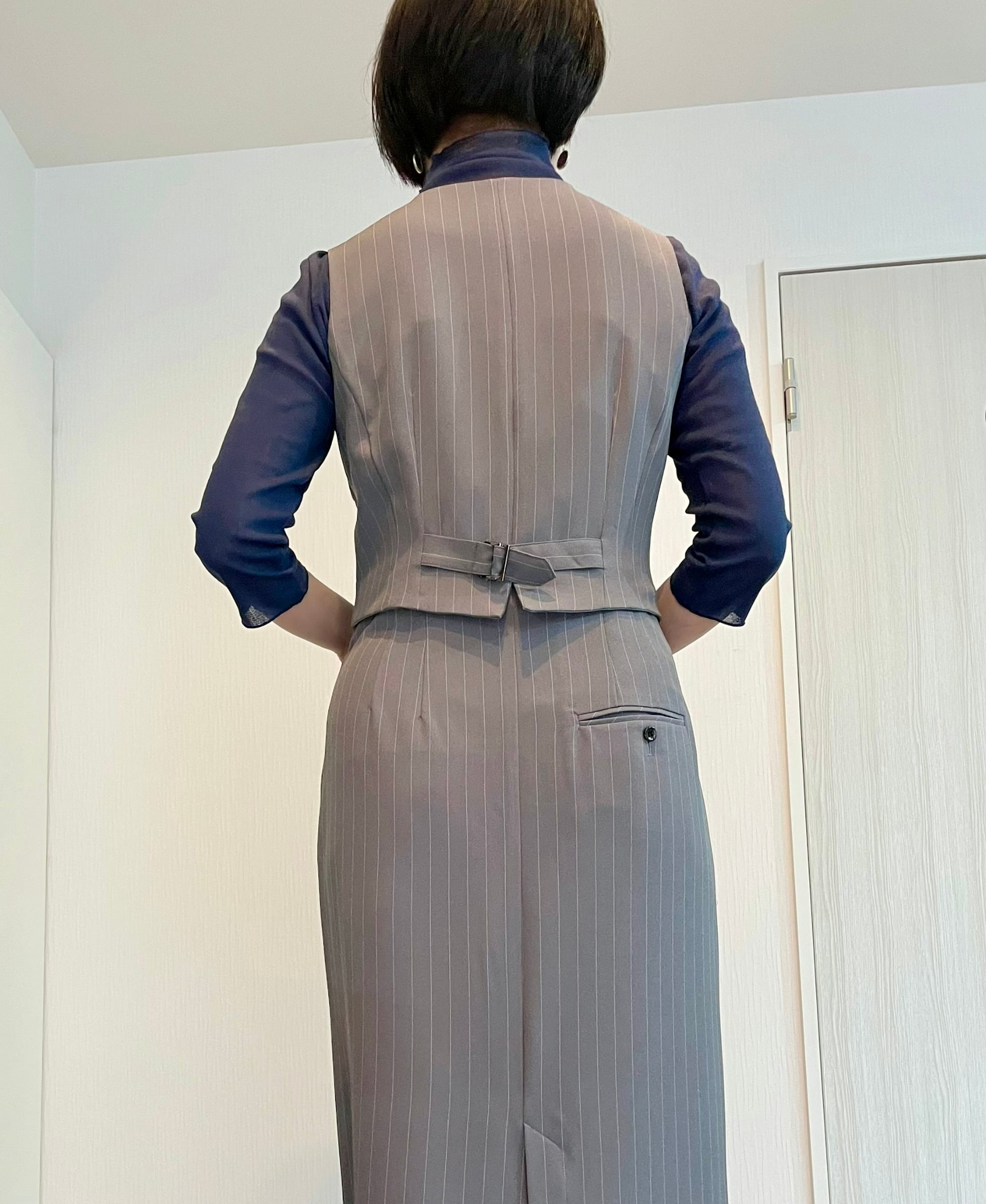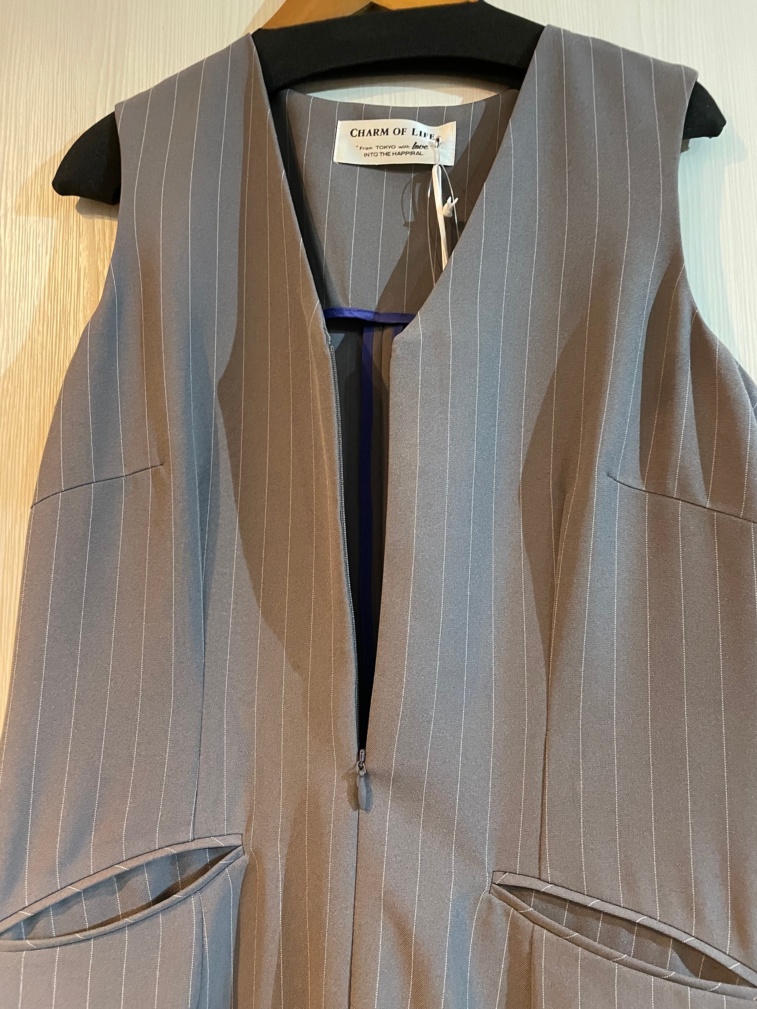 エレガントでありながらカジュアルな雰囲気を兼ね備えたピンストライプジレジャンスカです!着痩せ効果に優れたデザインが、シルエットを引き立て、ストレッチの効いた素材が快適な着心地を実現します。セットアップ風のスタイルは、インナーを着てもしなくてもオシャレに決まるため、普段使いはもちろん、特別なシーンにも幅広く活躍することでしょう。どんなトップスとも合わせやすく、コーディネートの幅を広げる一着です。