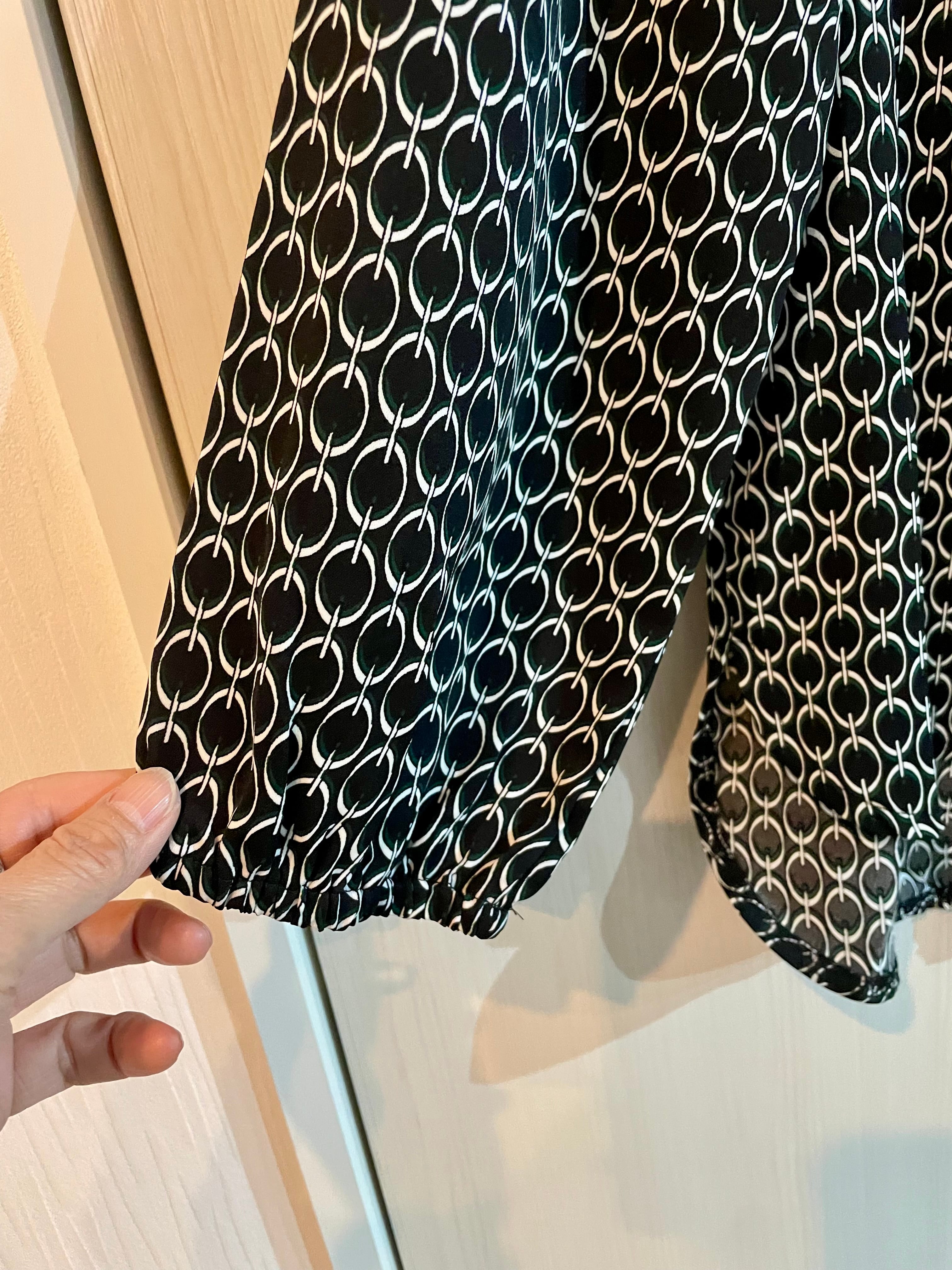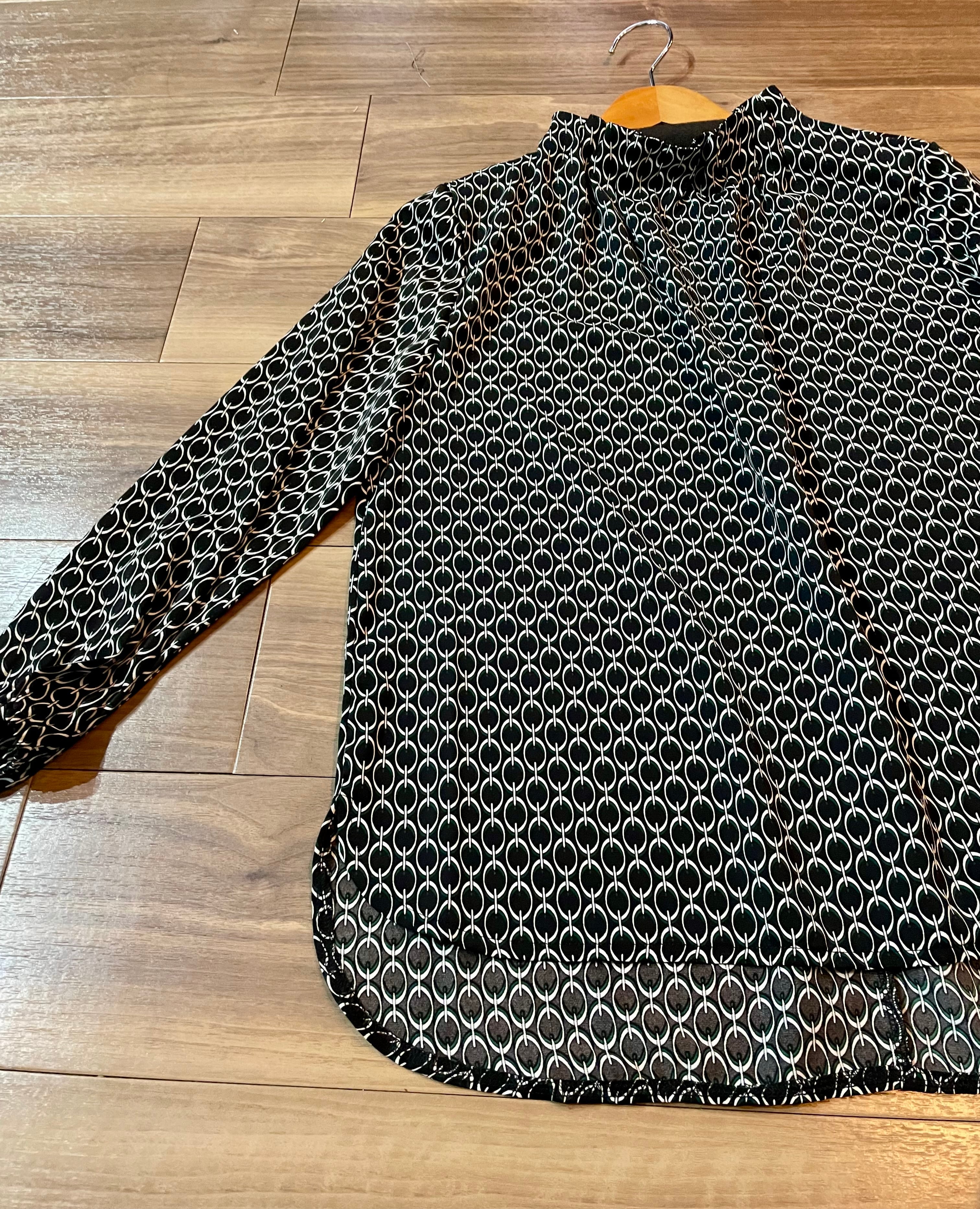 幾何学的なデザインが目を引く、洗練されたブラウスです!ボトルネックのゴム仕様により、さっとかぶるだけでスタイルが決まります。シンプルながらも個性的な幾何学プリントが、コーディネートに遊び心を添え、デイリースタイルから特別な日のおしゃれまで幅広く対応できるアイテムです。
