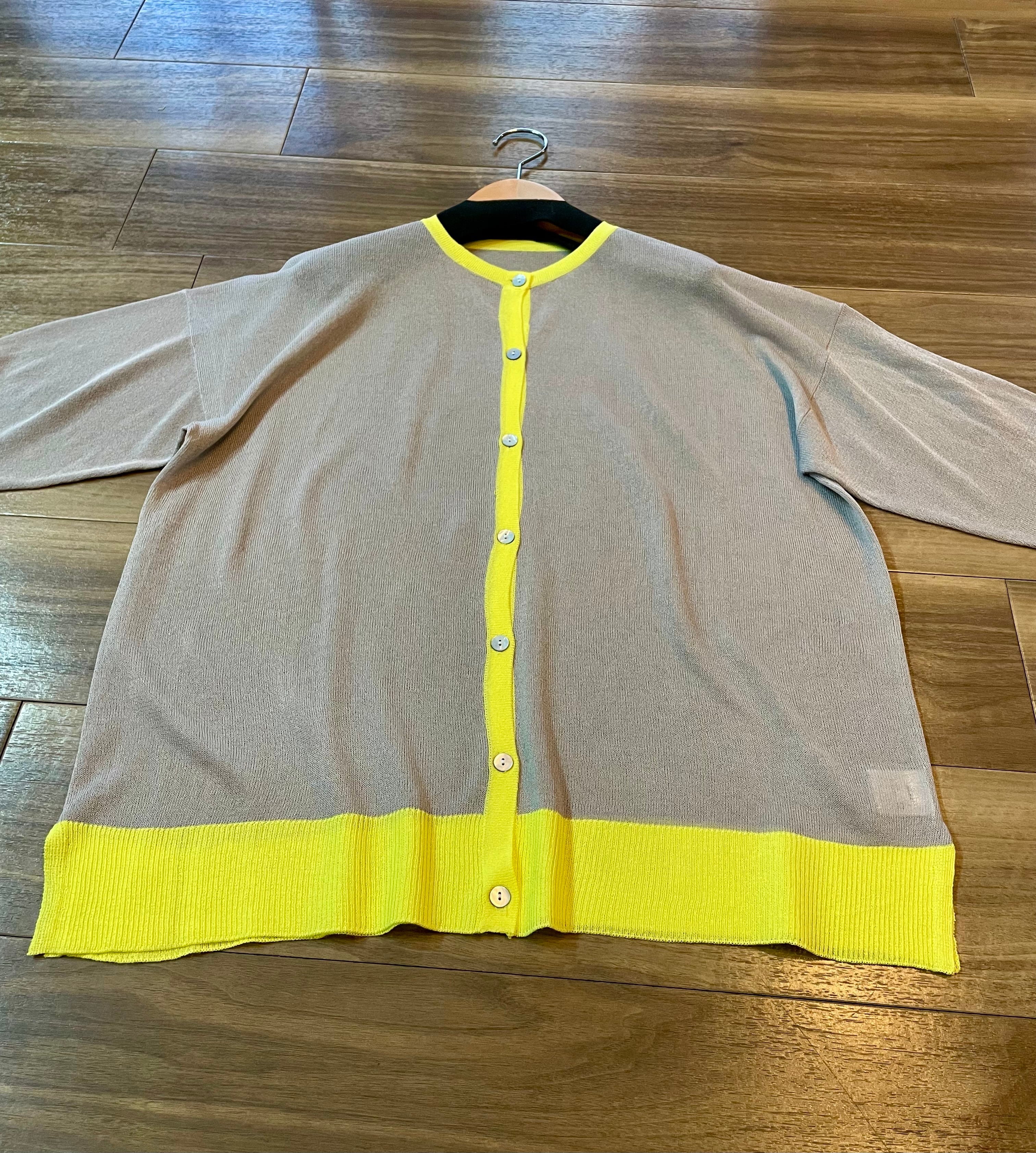 軽やかでカジュアルなスタイルを楽しめる、配色カーディガンです!レモンイエローの配色がポイントで、さりげないアクセントを加えながらシンプルなコーディネートを引き立てます。やわらかい素材感とリラックスしたシルエットが特徴で、普段使いからお出かけまで幅広くお使いいただけるアイテムです。