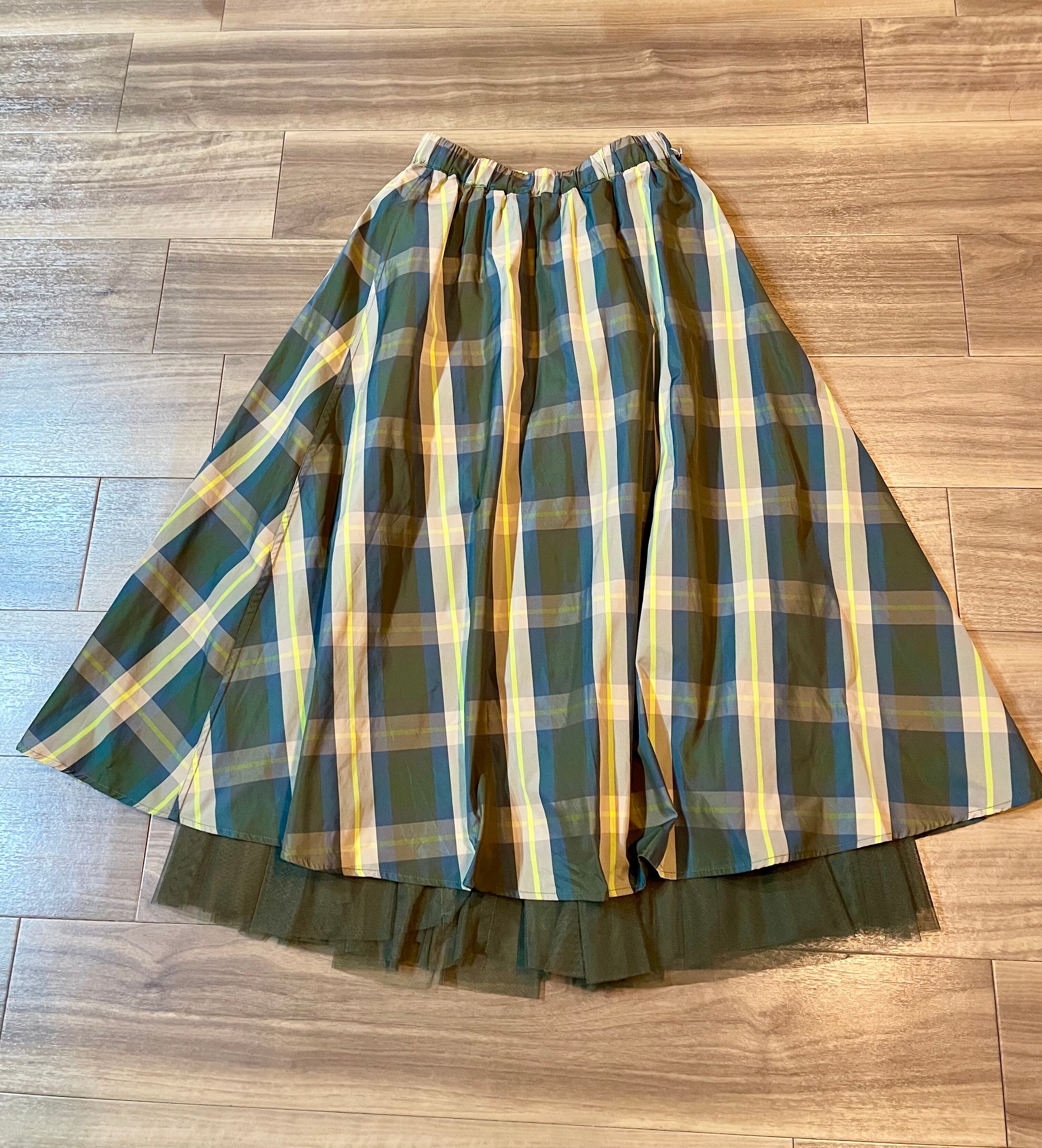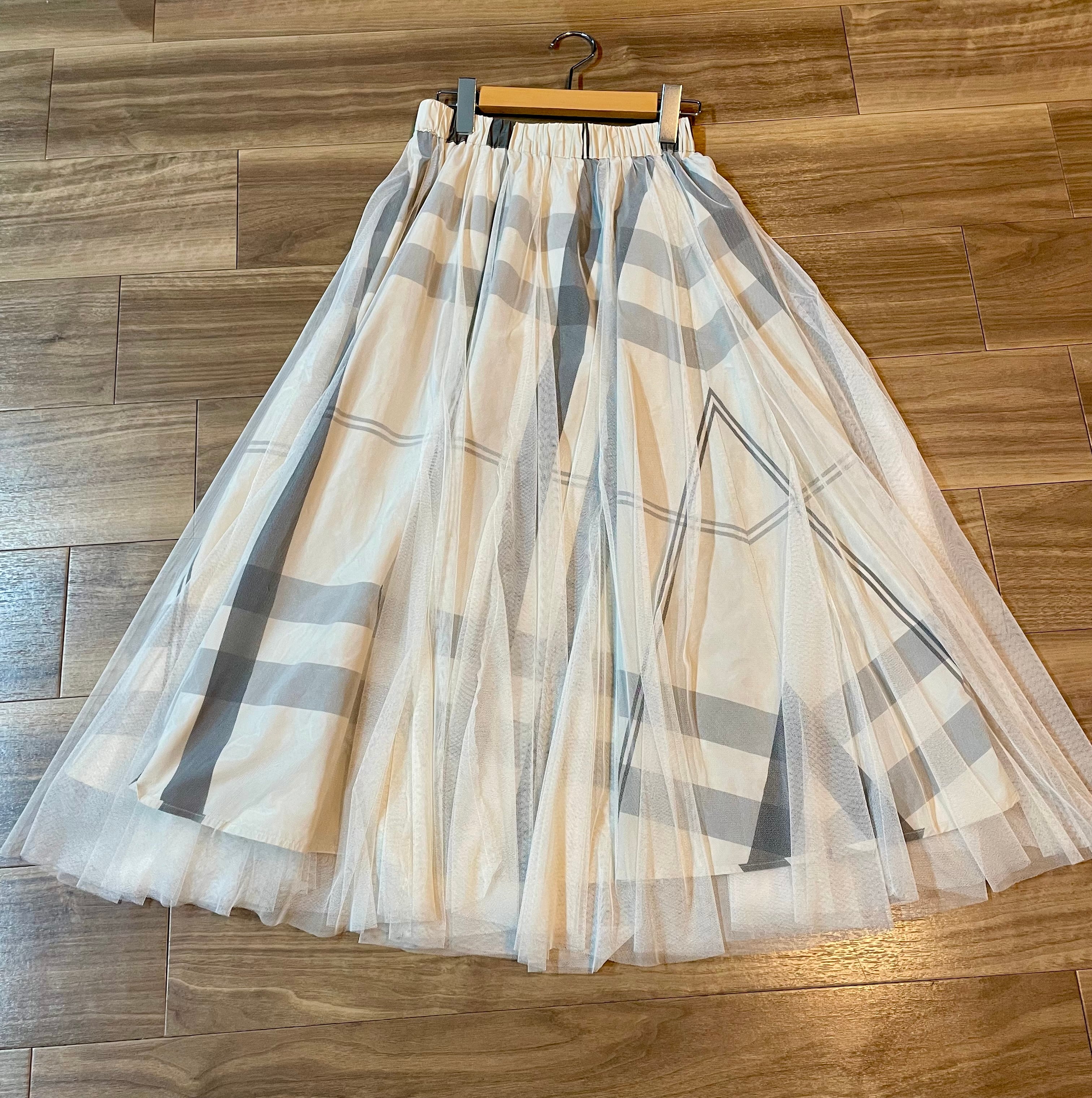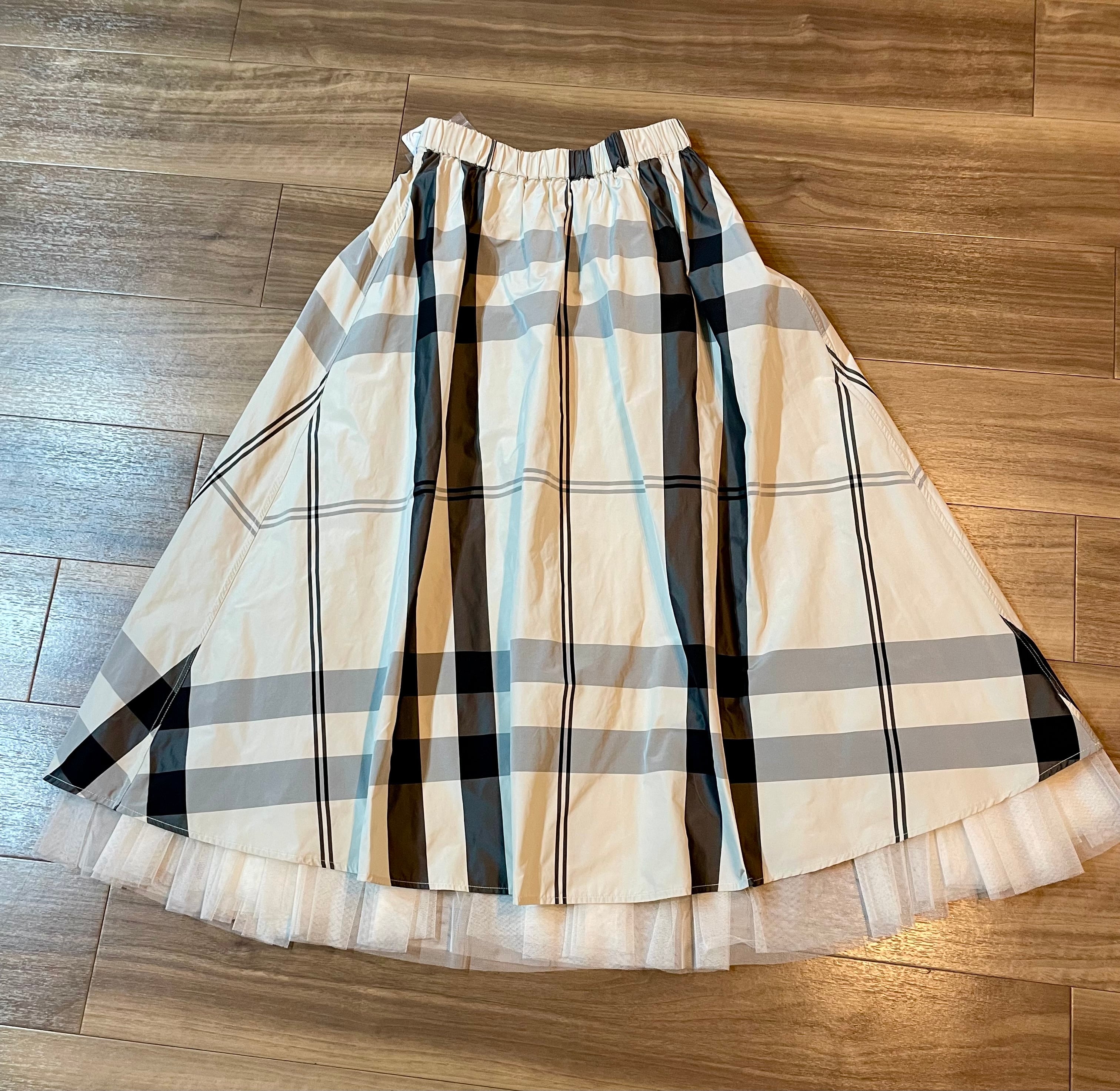 軽やかで華やかな印象を引き立てる、タフタ✖️チュールレースリバーシブルスカートです!特徴的なチェック柄が目を引くデザインで、リバーシブル仕様になっているため、気分やシーンに合わせて異なる表情を楽しめるアイテムです。軽やかなシルエットは、普段使いから特別な日まで幅広く活躍し、どんなコーディネートにも取り入れやすいです。